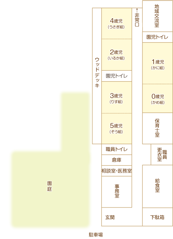 ・おおよその園内図です。子どもの目線に立った構造で、安全かつ清潔を心掛けた室内になっております。